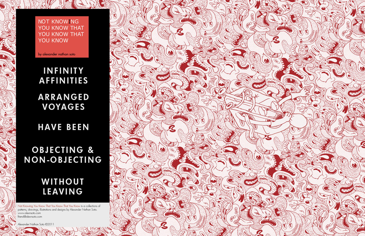 A highlight to the zines I have made. "Not Knowing You Know That You Know That You Know" features patterns, drawings and a heavy does of influence from Popeye and artist/musician John Cage. 2010